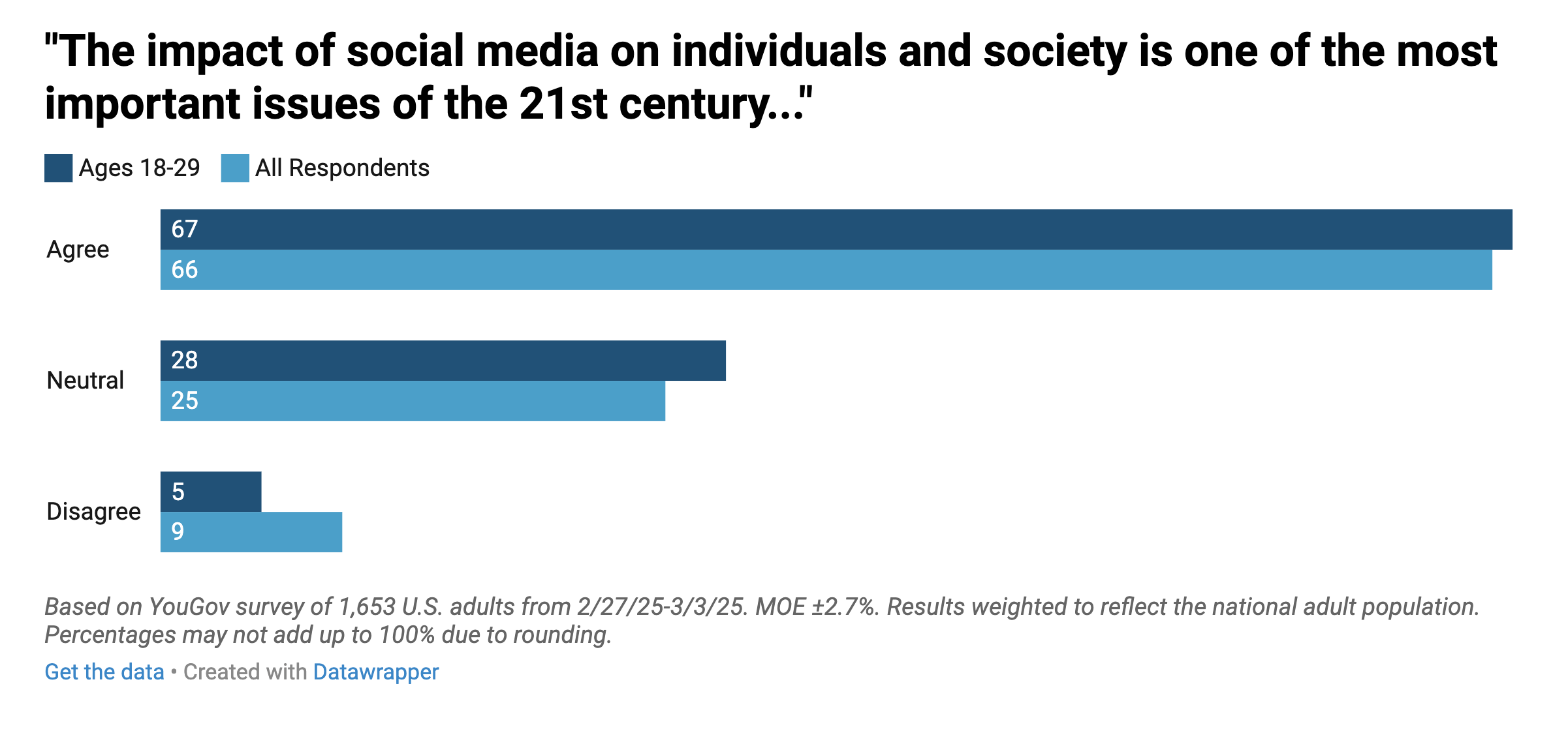 Two in three (65%) respondents somewhat or strongly agreed with the statement “the impact of social media on individuals and society is one of the most important issues of the 21st century.”